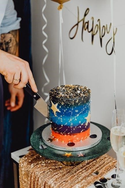 Explore Wilton’s Party Cake Cutting Guide for detailed diagrams and techniques. Online cake serving size calculators also assist in portioning for various events.